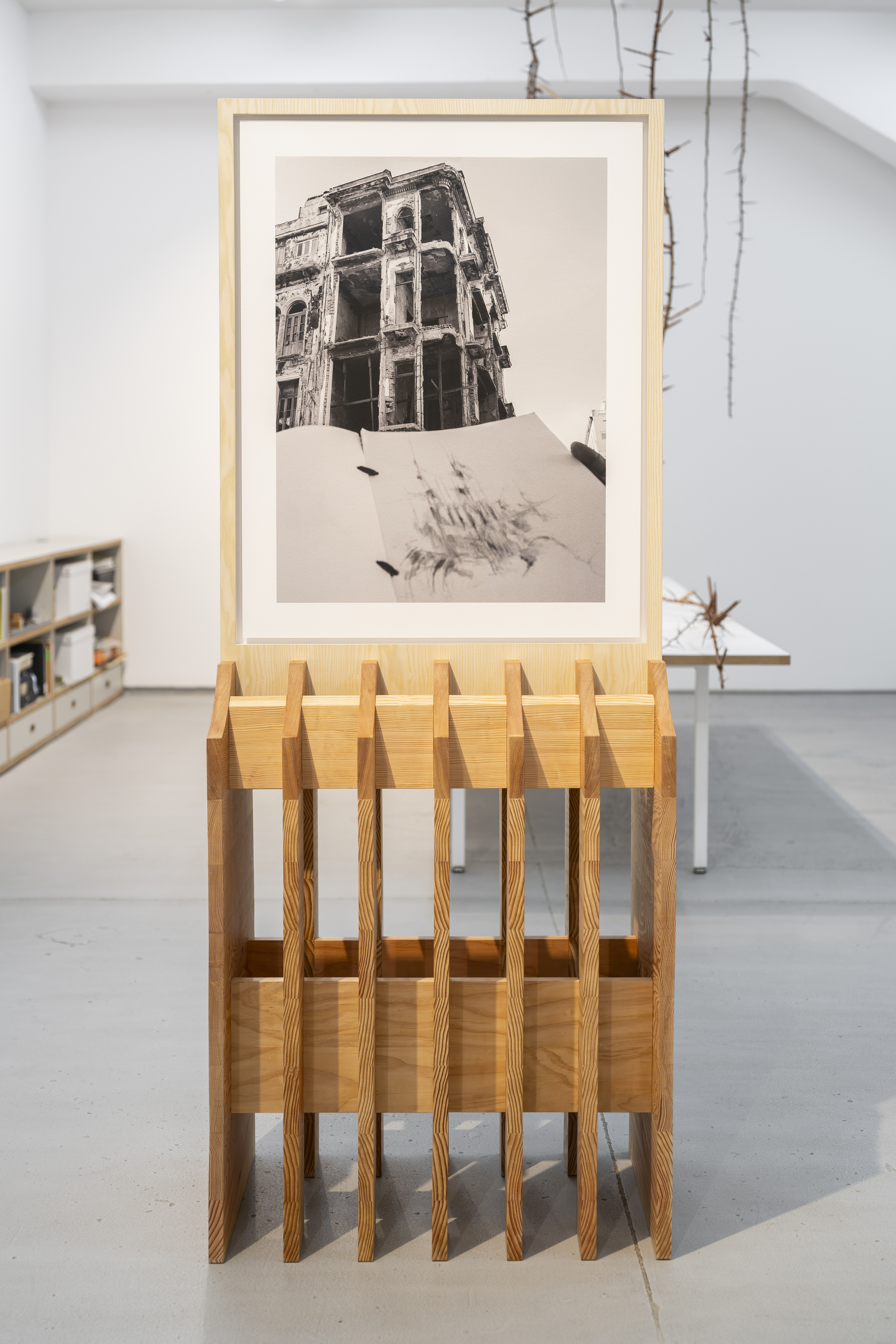 Arqueológica V , Carlos Garaicoa Fotografía B/N impresa en papel William Turner, grafito, madera de fresno y pino Oregón 189 x 75 x 50 cm (c/u) 2025 X Bienal Cortesía del Artista y Galería Elba Benítez