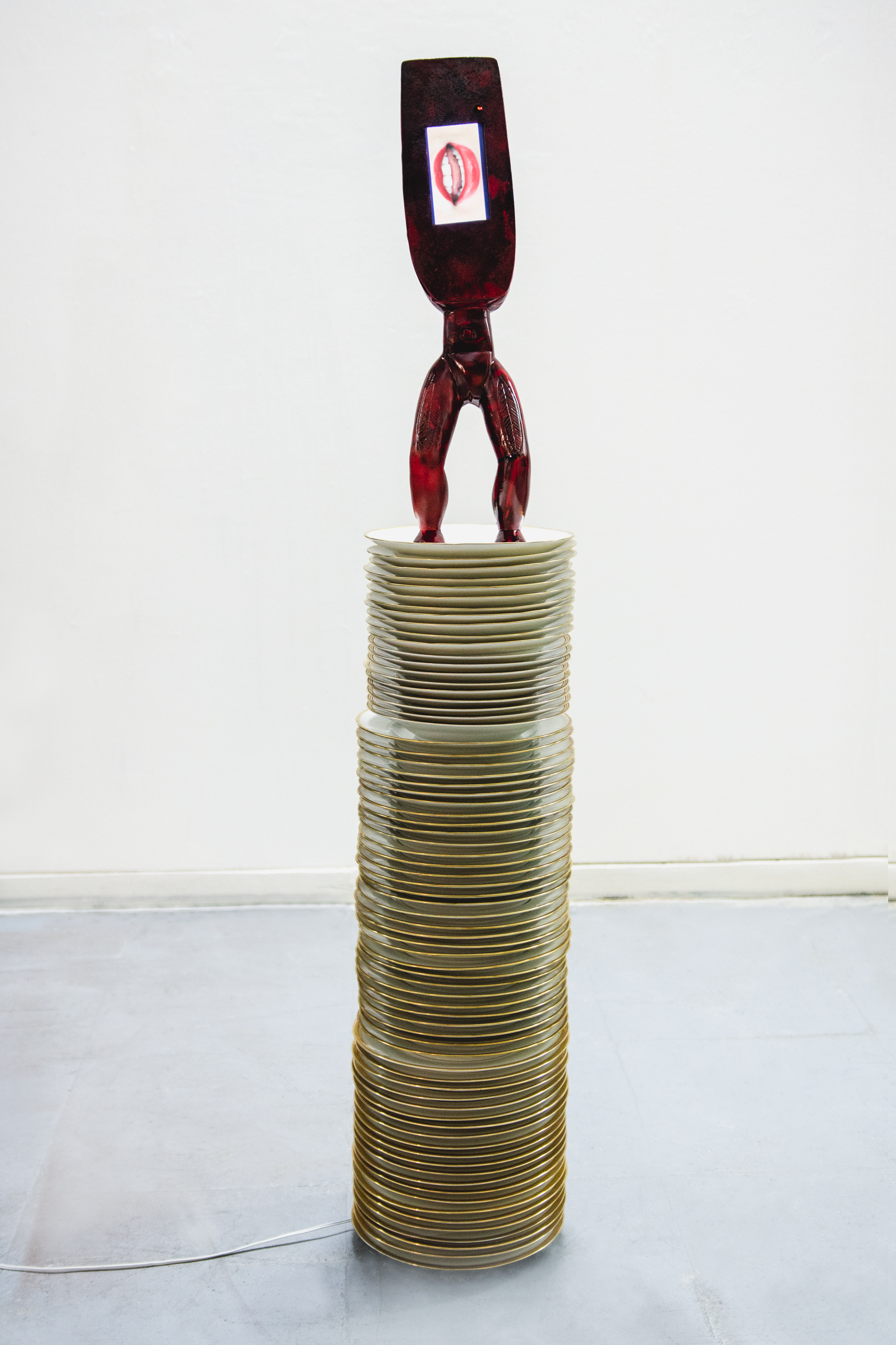 Yuyu Marina Vargas Técnica mixta (vajilla de porcelana de Limoges, estructura de hierro, madera policromada, vídeo) 135 x 25 x 25 cm 2024 X Bienal Colección SOLO
